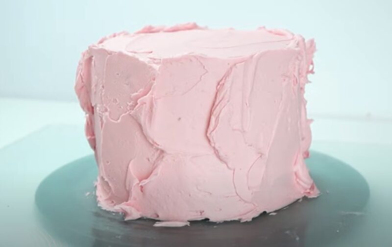 - Once the cakes have cooled, spread a layer of pink frosting on one cake layer. Place the second layer on top and frost the top and sides of the cake.